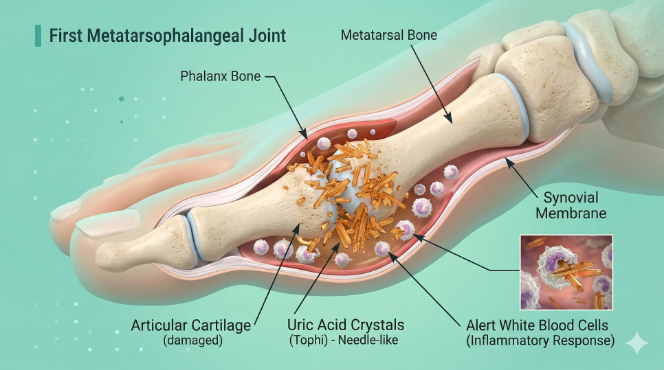 단순한 관절 문제가 아니라 요산 결정이 발가락 관절에 먼저 쌓이면서 나타나는