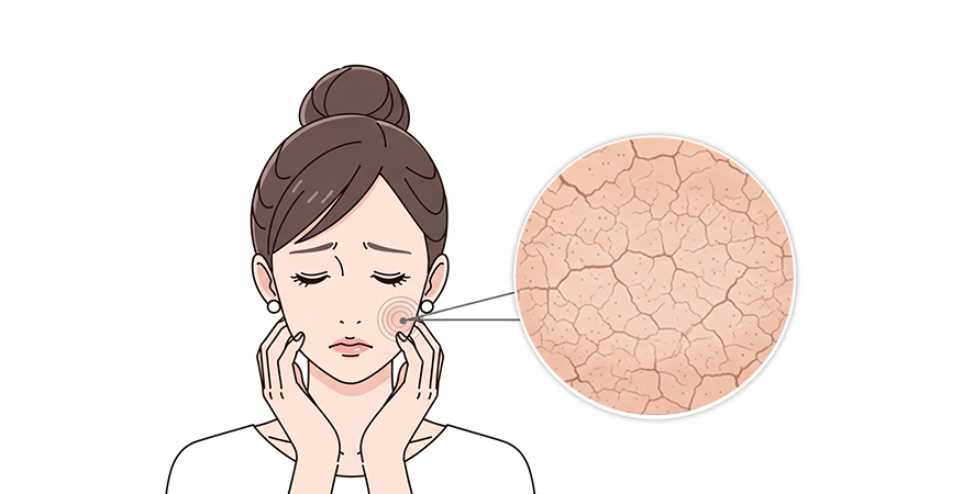 낮보다는 밤에 더 심해지며, 피부의 피지선과 땀샘이 위축 돼 피지와 땀이 줄어들면서 표면이 건조해지는 현상이예요.