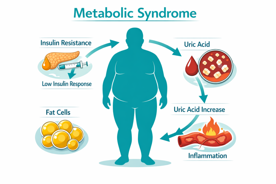 그 이유는 인슐린이 신장의 요산 재흡수를 증가시키기 때문입니다.