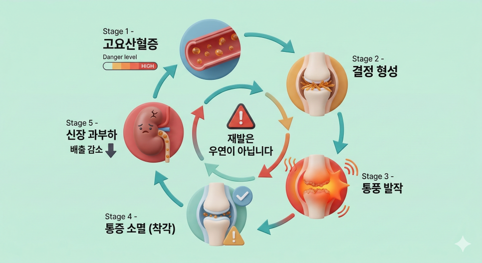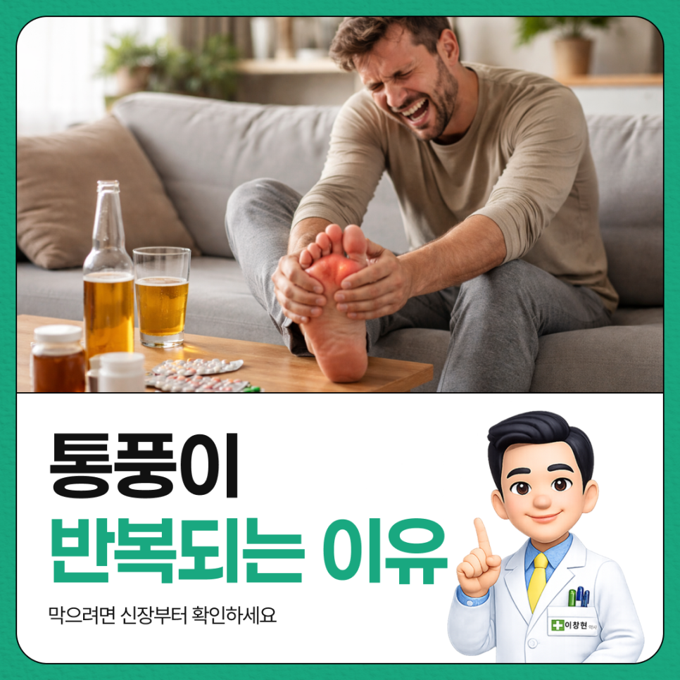 통풍 재발을 막으려면 통증만 볼 것이 아니라, 신장의 요산 배출 능력과 생활습관까지 함께 관리해야 합니다.