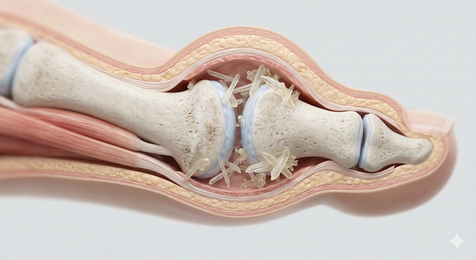 관절 안에는 요산 결정(요산이 굳어 생긴 미세 결정체) 이 일부 남아 있을 수 있습니다.
