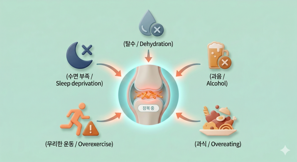 탈수, 과음, 과식, 무리한 운동, 수면 부족처럼