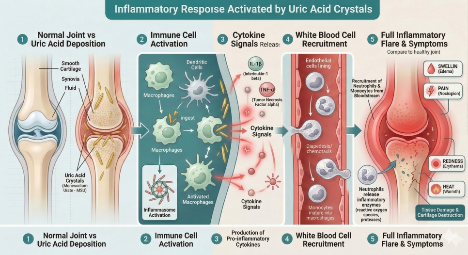 관절 속 요산 결정이 면역세포를 자극하면,